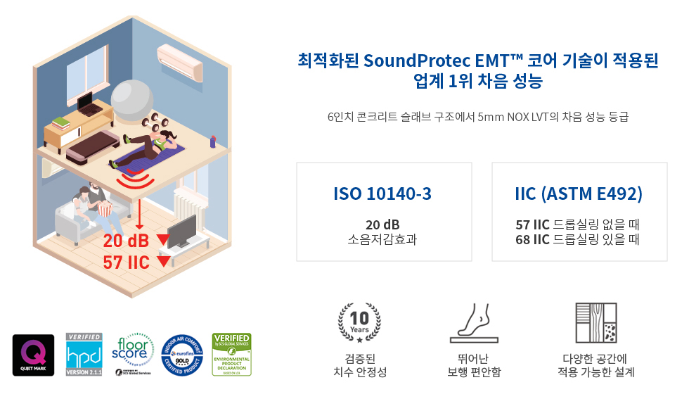 녹수 EMT™(Eco-Multi-Tecture) 코어 공법을 적용하여 소음 문제를 해결한 고성능 어쿠스틱 시스템입니다.